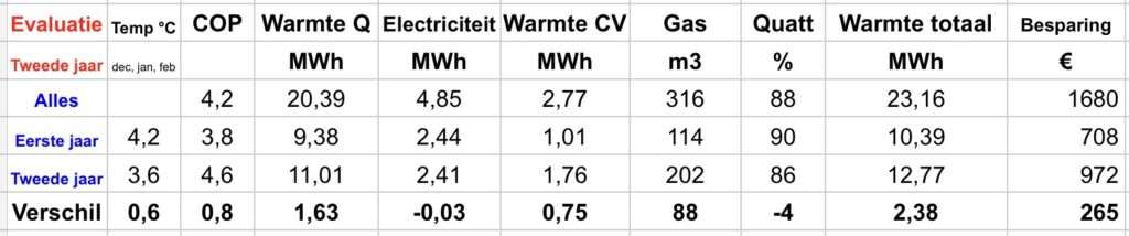B. COP. De behaalde SCOP is dit jaar beduidend hoger. 4,6 in vergelijking met 3,8 het jaar daarvoor. Een echte verklaring heb ik niet. Wel heb ik het idee, dat in de Silent modus de Quatt nu eerder stopt dan een jaar geleden. Nu rond 1100W, daarvoor tikte hij de 1400W nog wel eens aan. Dat betekent ook eerder gas bijstoken en dus een hogere COP. Dan zou dit een aanpassing van Quatt moeten zijn. Zeker weet ik dit niet.